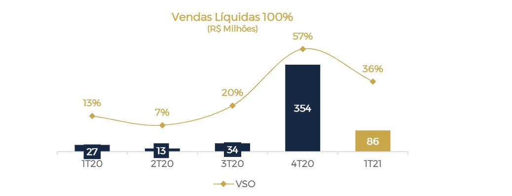 A velocidade de venda VSO atingiu 71,8% no acumulado em 12 meses e 35,6% no 1T21, +22p.p. em relação ao 1T20.